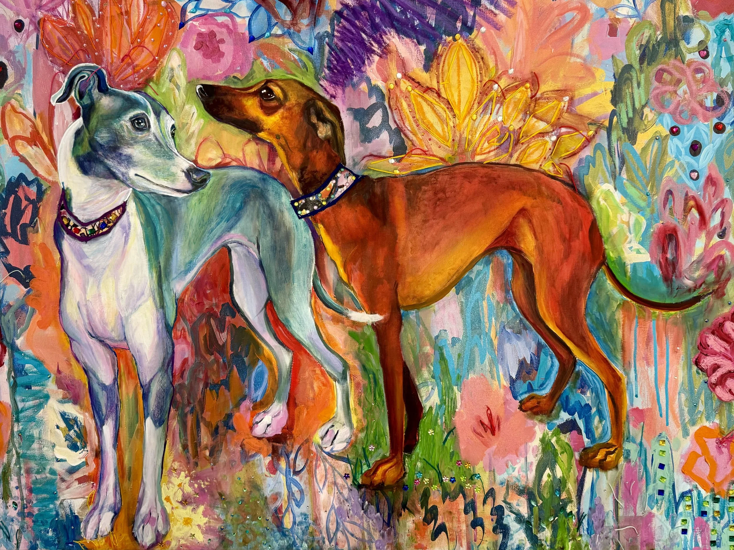 Exploration features a reflective and playful investigation into time and space. The dogs are inquisitive and proud. The dog on the left turns toward the past, crowned by a flower. The dog on the right faces forward toward the future, while exhibiting a crown of frustrated thoughts expanding externally through energetic purple lines. They overlap in an impossible way, creating a tension between these two states.