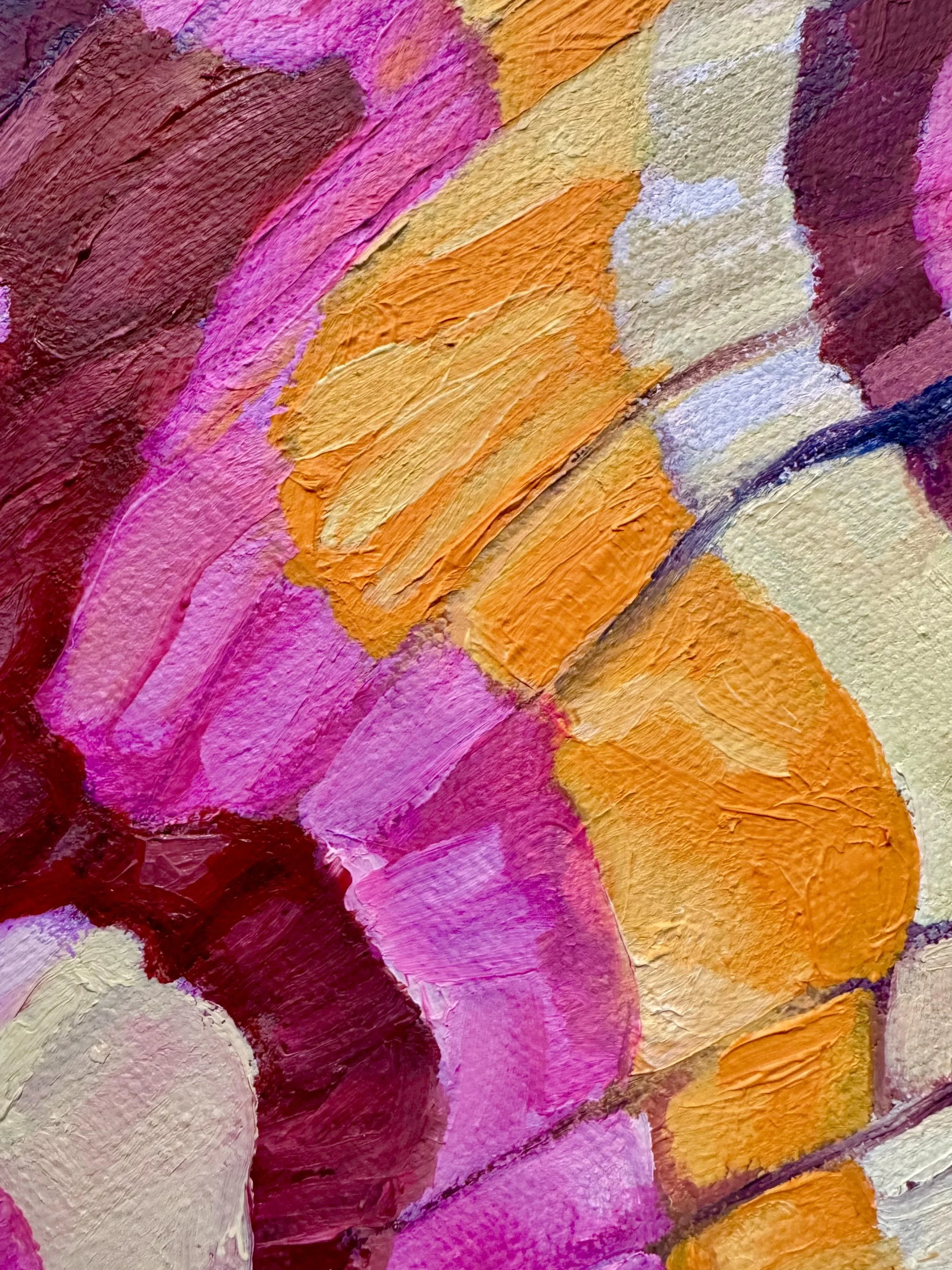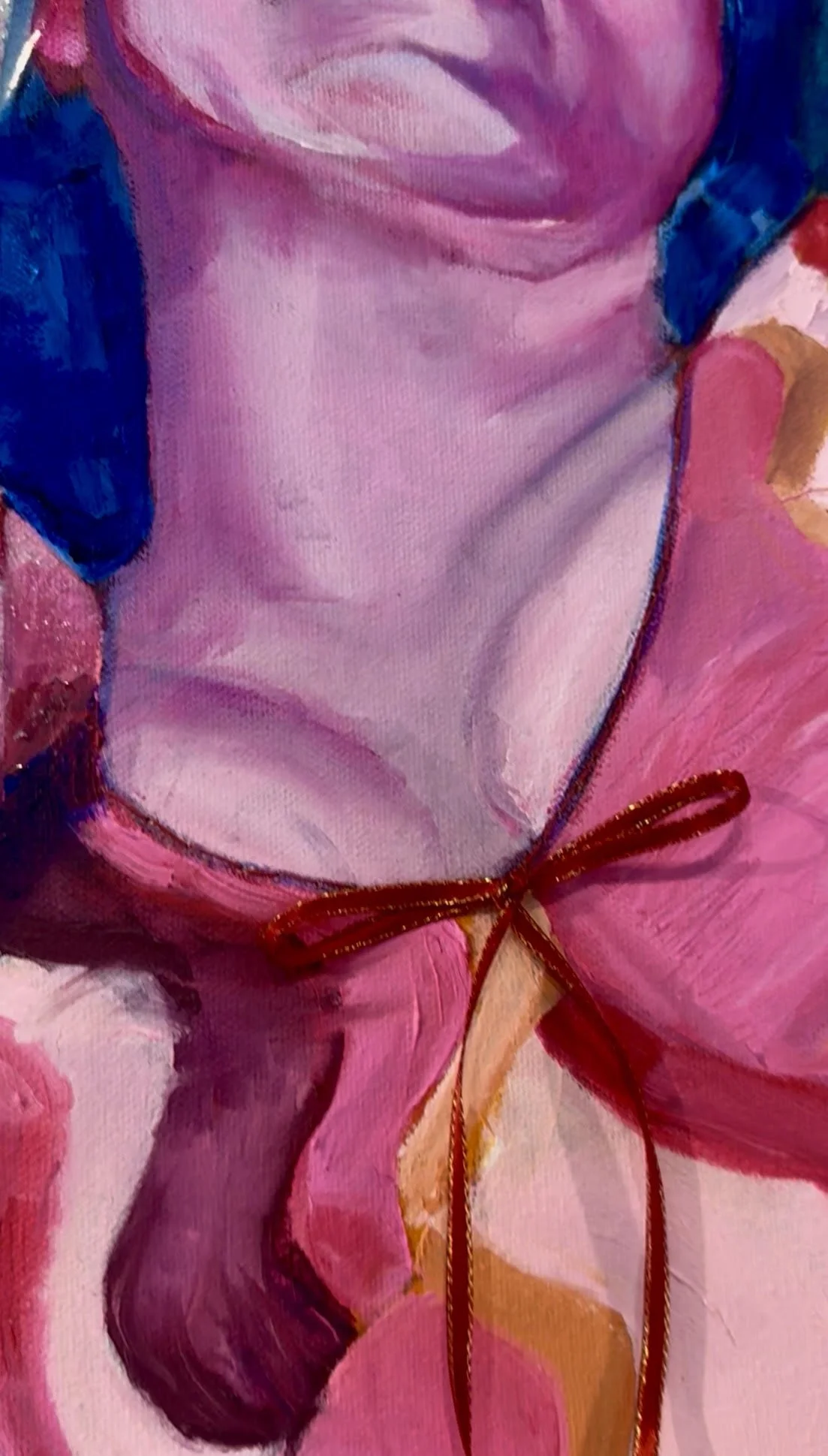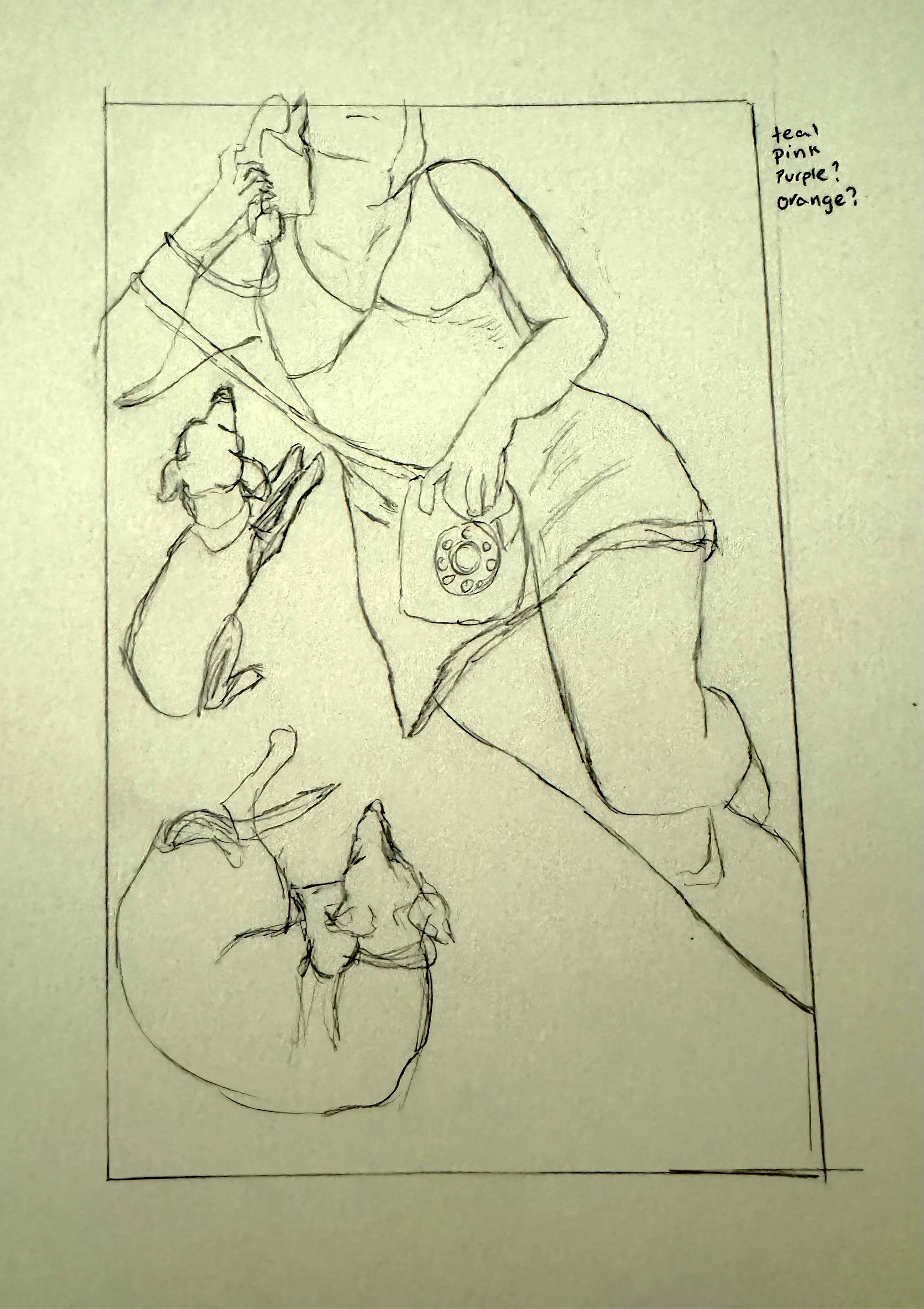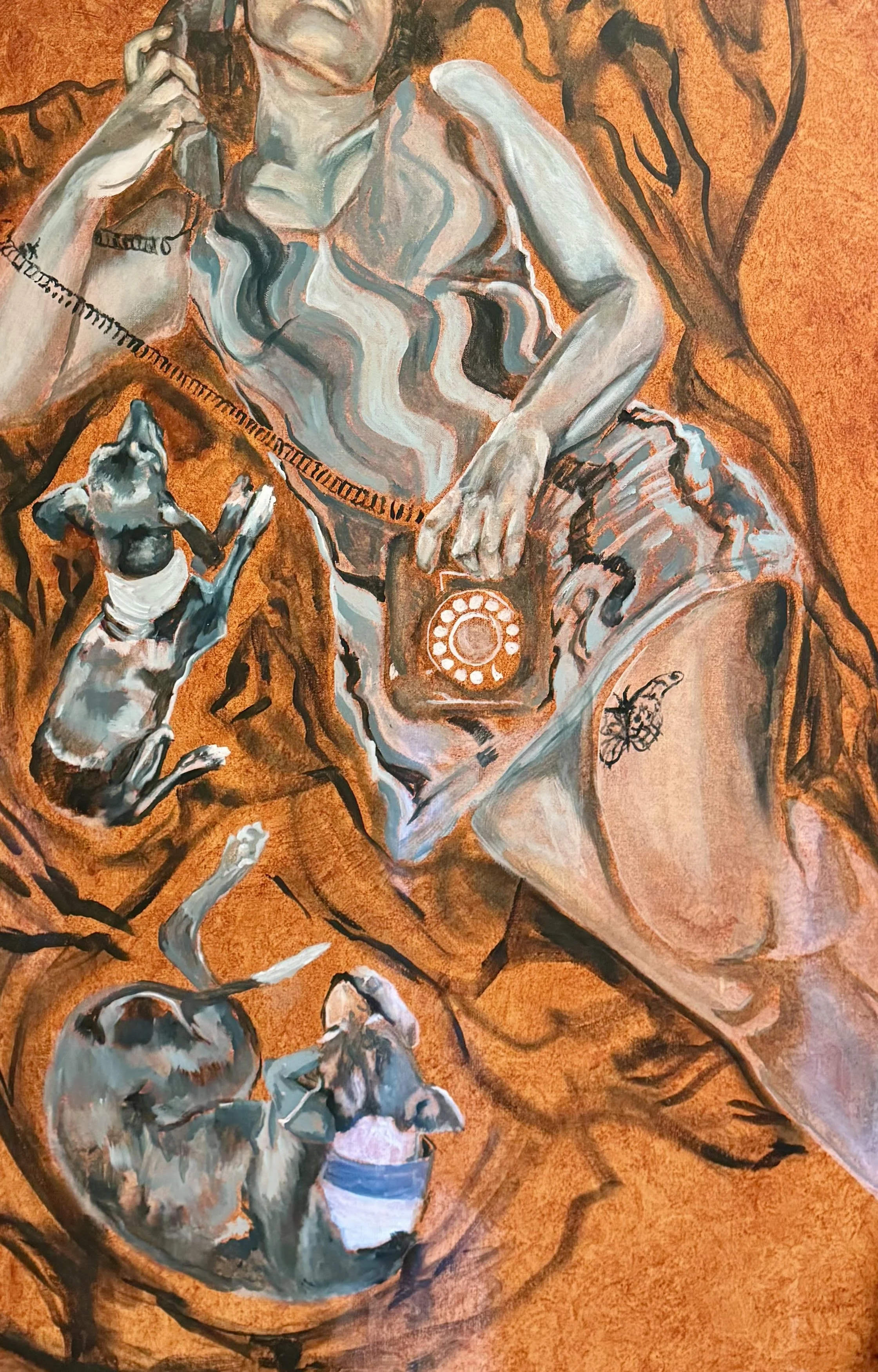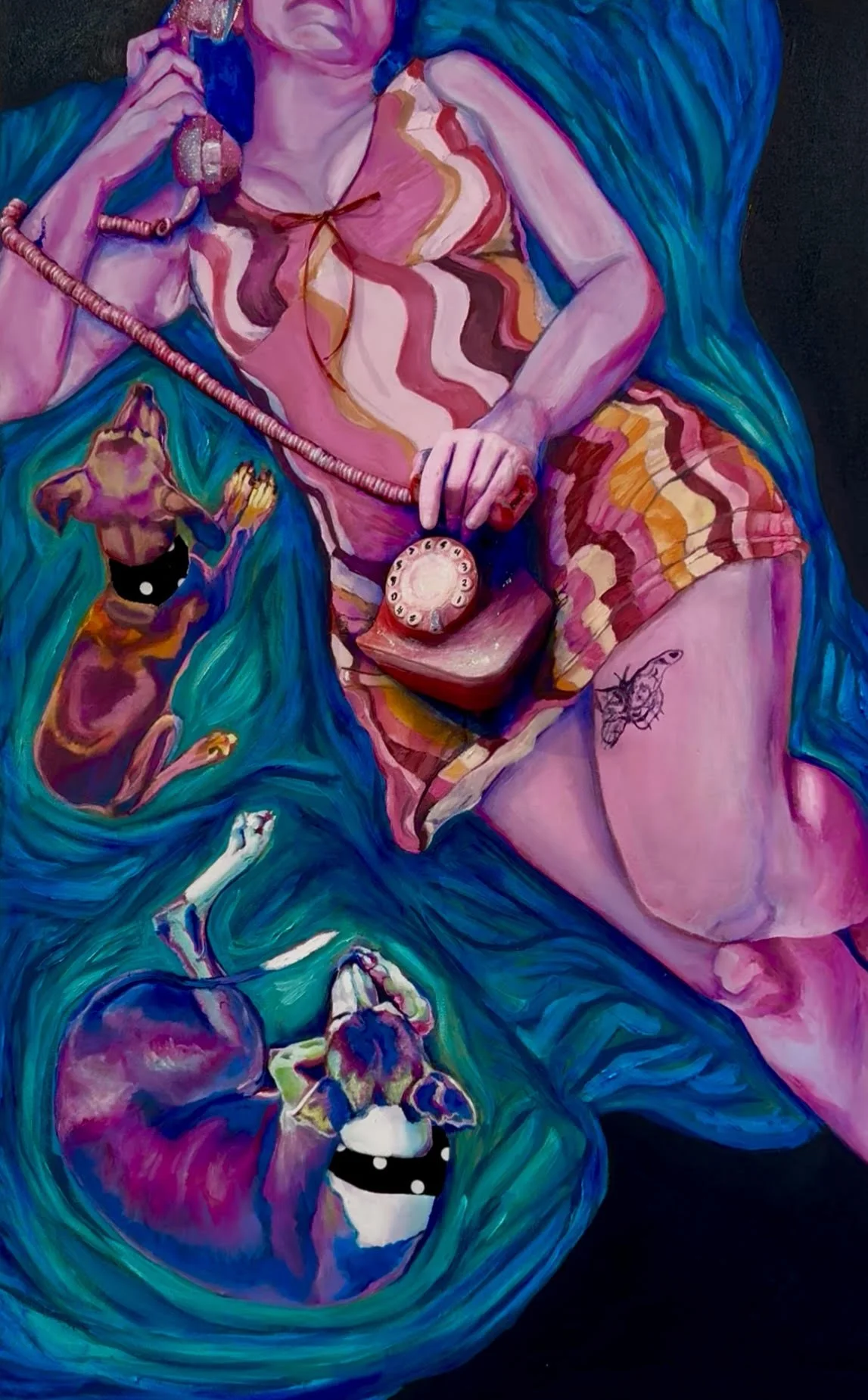 This autobiographical painting features the artist and her two Italian Greyhounds submerged in a pool of fabric of unknown depth. The three exist just below the surface of semi-transparent water. The figure is holding a rotary phone to her ear while she’s twisting and pulling away from it. The wrapped cord around her arm suggests a type of self-imposed psychological shackle. She seems unaware of the physical break in the cord. The hand rests above the switch hook, on the edge of hanging up. The positioning is provocative. Both dogs rest comfortably, suggesting a long conversation, yet look to the figure impatiently, waiting for it to end. Above the water’s surface is the hand, phone, and cord; they act as a type of lifebuoy. Tortured yet nostalgic, the composition is reminiscent of 90s magazine spreads.