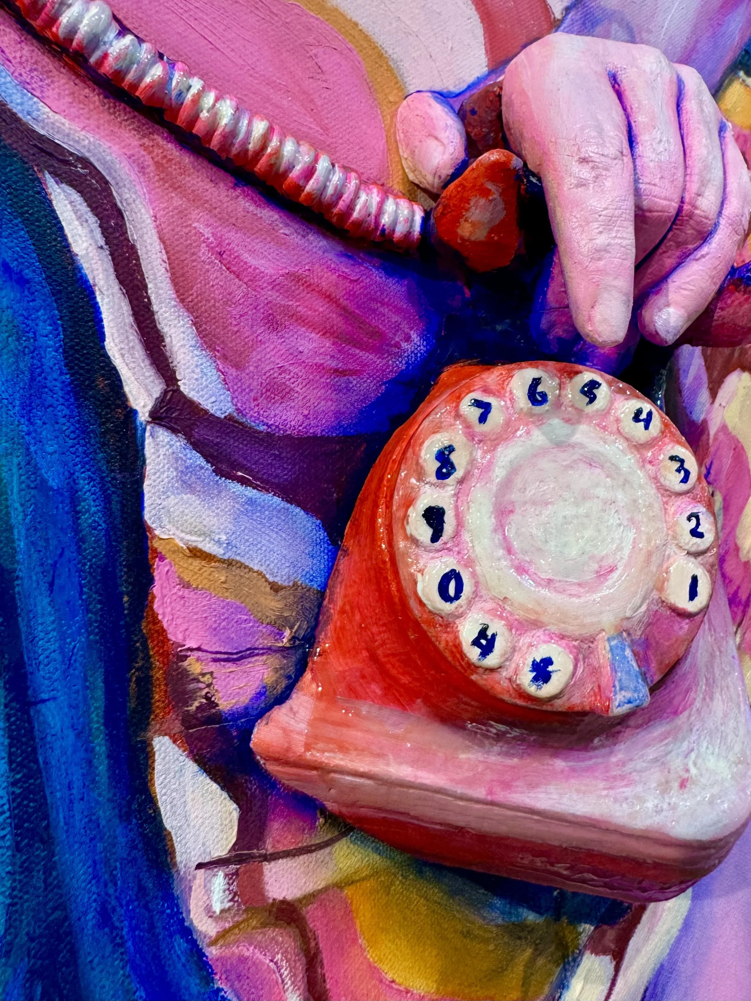 The painting features a 3D sculpted hand and phone, which are made of plaster and polymer clay. Specific areas are coated in resin to mimic a plastic feeling. Collars are made from sewn fabric. Detailing on the dress includes embroidery and ribbon.