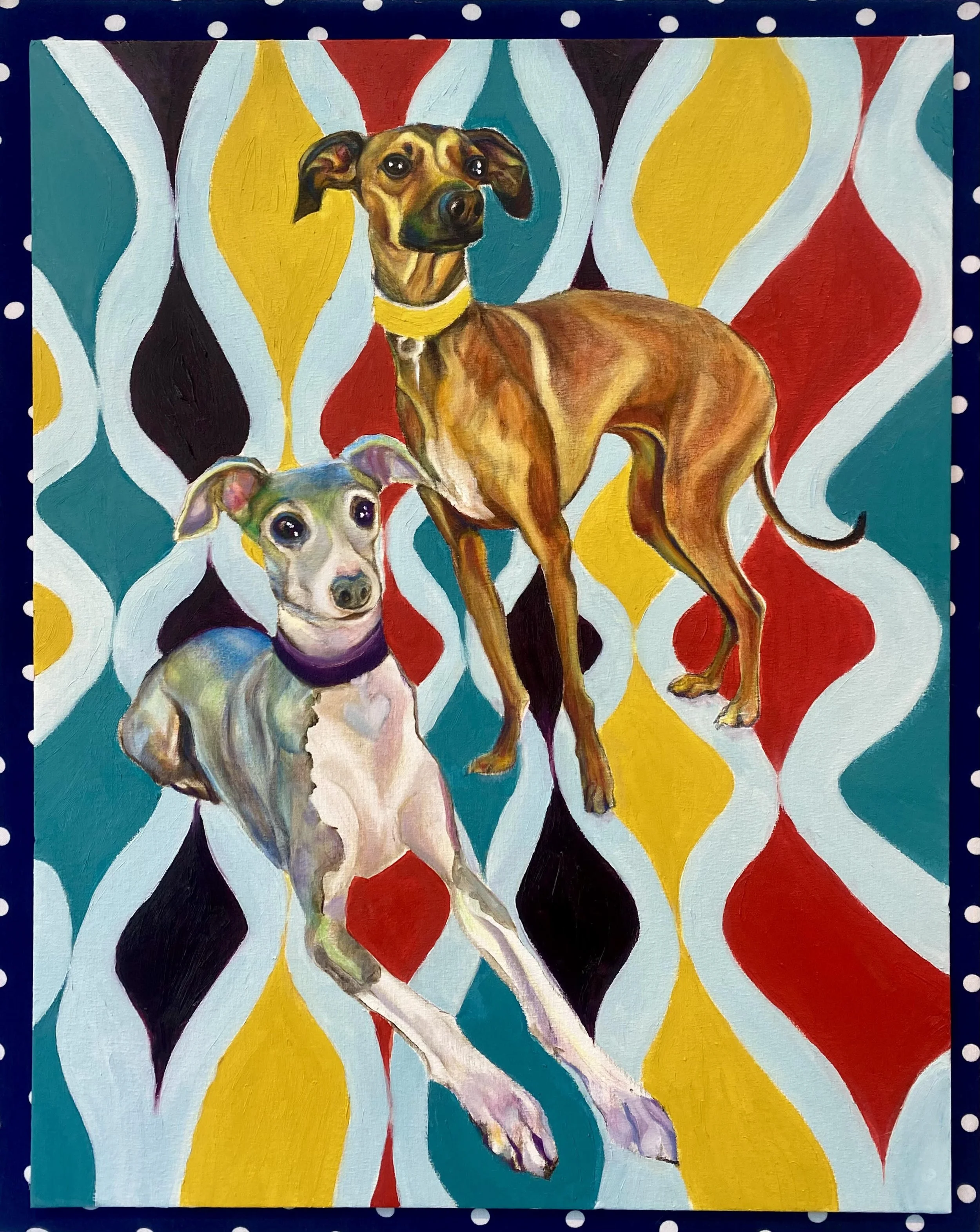 Illusion is a painting of the artist’s two Italian Greyhounds. They exist in a disorienting liminal space. The thinly applied oil paint gives an ephemeral appearance. Their alien-like hypnotic expressions challenge the viewer. The energetic patterning of the painting is inspired by jazzy musical rhythm.